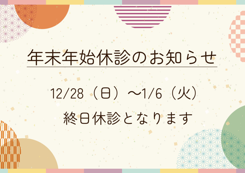 2025.12.18 休診案内 年末年始休診のお知らせ(12/28~1/6) 12月28日(日)~1月6日(火)は終日休診となります。※日曜・木曜は定休・年内最終診療日: 2025年12月27日(土曜日)9:30~13:00 ・新年診療開始日:2026年1月7日(水曜日)9:30~13:00 ・時間<月・水・土曜日>9:30~ 一般診療 ※最終受付 11:0011:30~ 乳幼児健診 ※事前予約制12:00~予防接種 ※最終受付12:30<火・金曜日>16:00~ 乳幼児健診 ※事前予約制16:30~ 一般診療 ※最終受付18:30 お知らせ一覧へ戻る